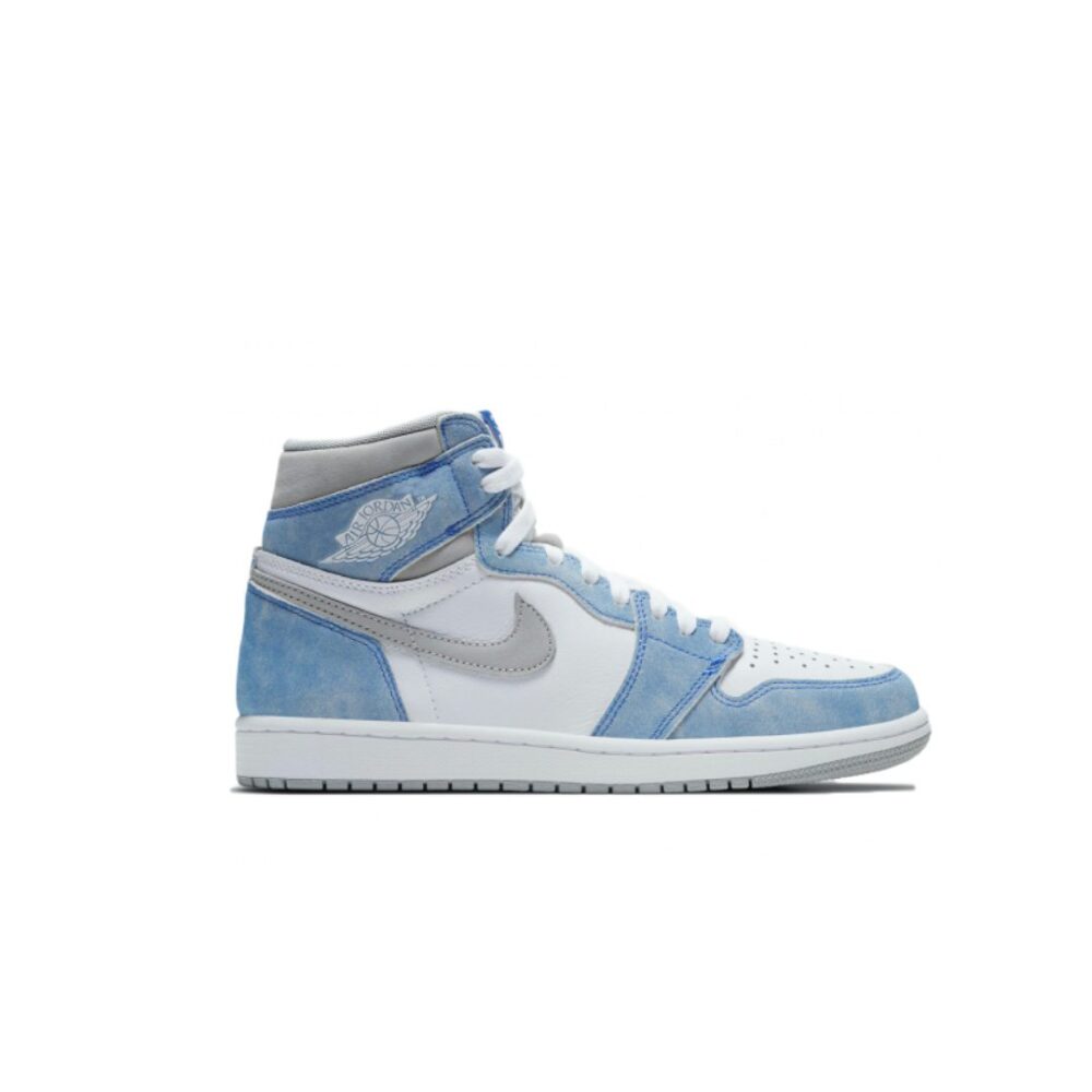 The Air Jordan 1 Retro High OG ‘Hyper Royal’ brings a weathered look to the basketball classic. The shoe’s upper features a white leather base, overlaid by suede that sports a faded blue aesthetic. Light Smoke Grey complements the Swoosh and padded collar, while underfoot, a white Air midsole is included for cushioning. Further Light Smoke Grey emerges on the concentric rubber outsole.